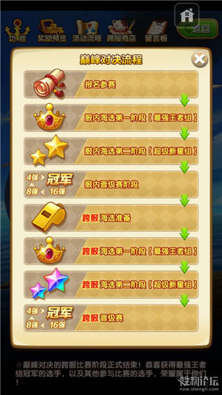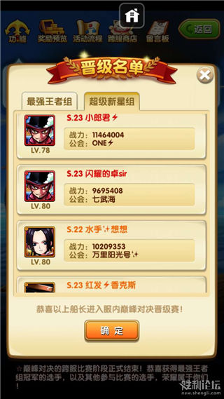 1、首先是服内巅峰对决,先是海选,分王者组和超新星组,战斗力前四的自动进入种子队,不需要海选,海选的话先是王者组,这个就是全服大PK,报名的人系统“自动随机”分配对手,当然这个自动随机是要打引号的,因为系统还得是保证战斗力前32的大部分能够进入王者组,所以我推测并不是完全的随机,否则一个排名10左右的连续遇到前5、6、7的,淘汰进入超新星也得哭死,所以会匹配的大部分还是低战力的选手,王者组三次战败就淘汰到超新星海选,如果超新星再三次战败,就彻底淘汰了,就酱油了,海选是48小时,但是实际上几个小时就全部海选完成了。