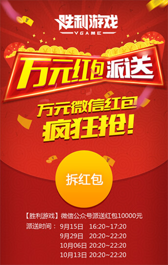 参与方式:活动期间内,关注【胜利游戏】微信公众号,回复关键字:无游戏不人生,即可参与微信抢红包!