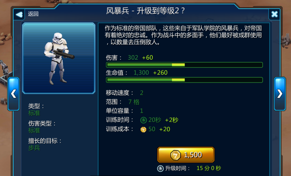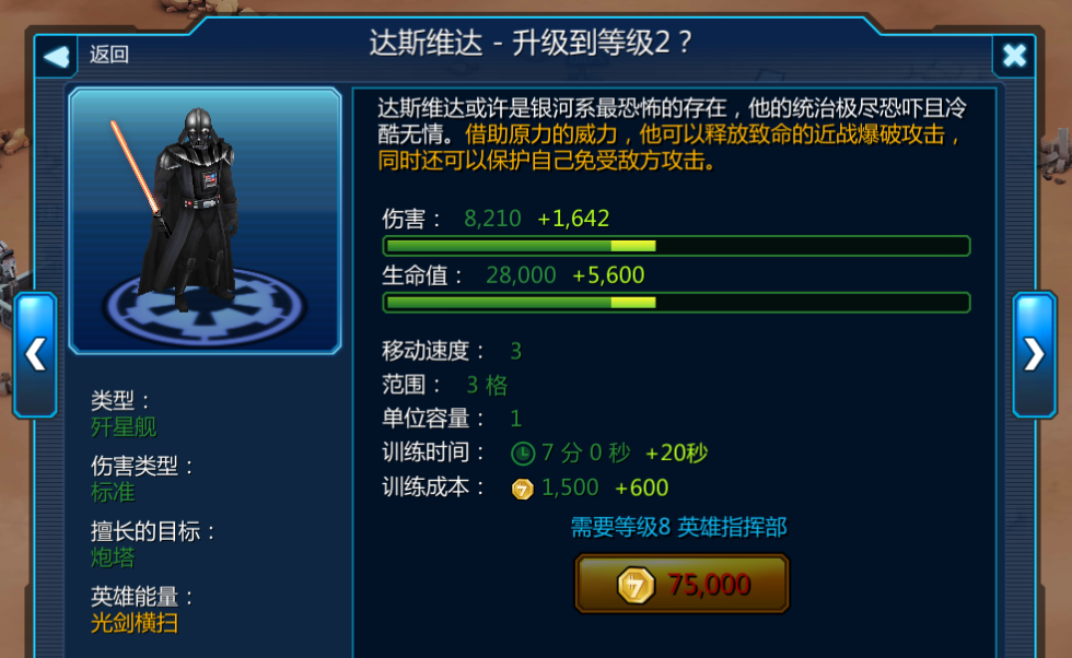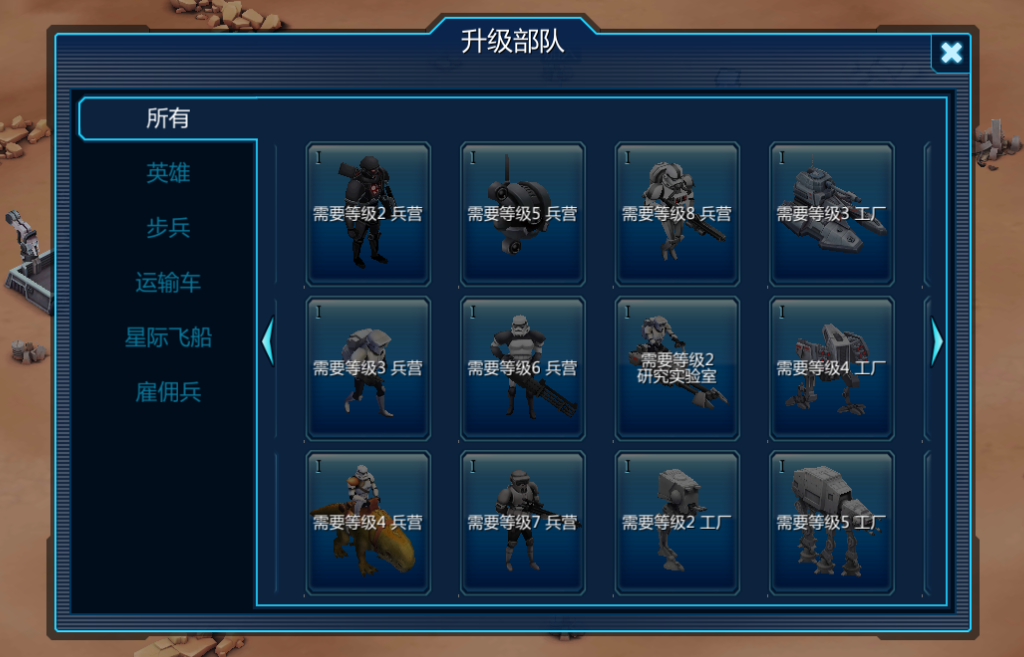 研究实验室是总部等级3时解锁的建筑,你可以从这里研究各种强力的部队、载具、英雄、飞船和雇佣兵来升级并协助你战斗。如果你接触过《星球大战》系列,相信你也会对研究室非常感兴趣,因为研究室包含了几乎所有《星球大战》系列中的角色。