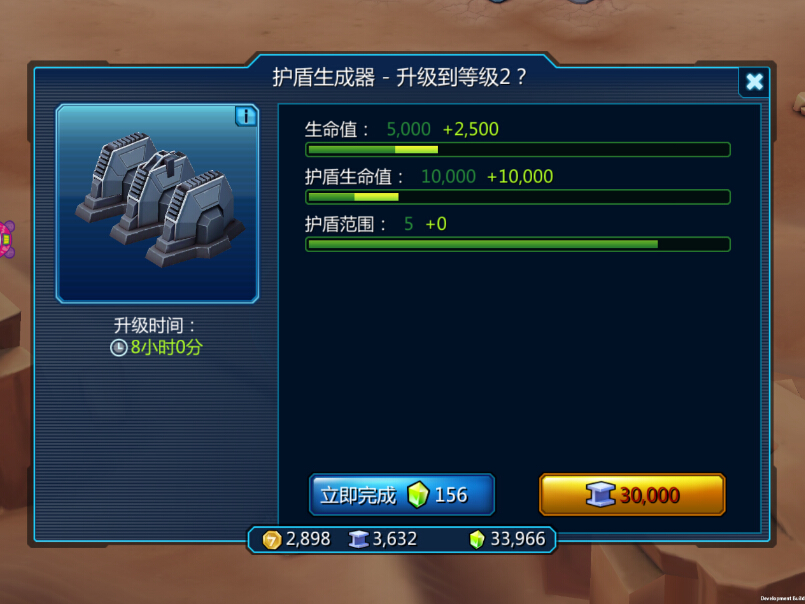 每升级一次护盾生成器,其生命值、护盾生命值、护盾范围都会随之增加。在实际战役中,高等级护盾可更大限度保护你的建筑。