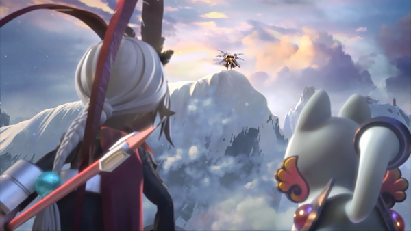 在这段CG中,一位头戴凤翅冠、身着金凯,手持三戟长枪的神秘勇士,身边带着一个白色萌犬迅猛出击,对着天上漂浮着那位机甲上仙怒目相视!
